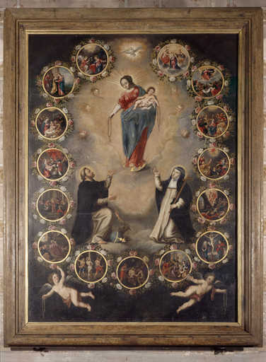 20000201138PA - tableau d'autel et cadre : Notre-Dame du Rosaire entre saint Dominique et sainte Catherine de Sienne