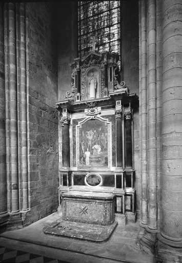 20020200475P - ensemble de l'autel secondaire Saint-Crépin et Saint-Crépinien (plate-forme d'autel, autel-tombeau, gradin d'autel, retable architecturé à niche)