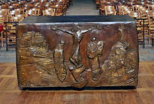 19976000485XA - autel post-concillaire : scènes de l'Ancien testament (Entrée à Jérusalem, Crucifixion, buisson ardent, Noé lâchant la colombe depuis l'arche)