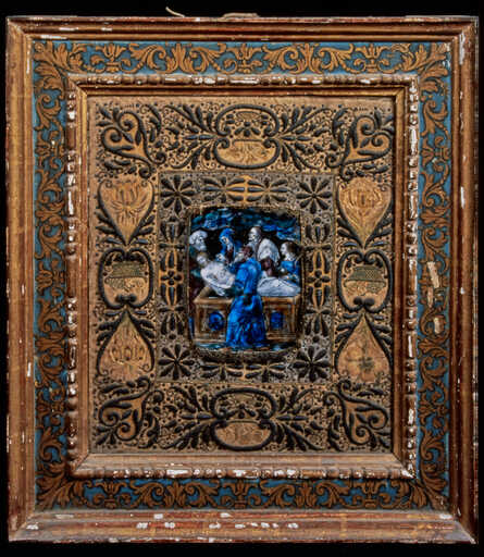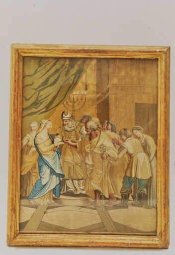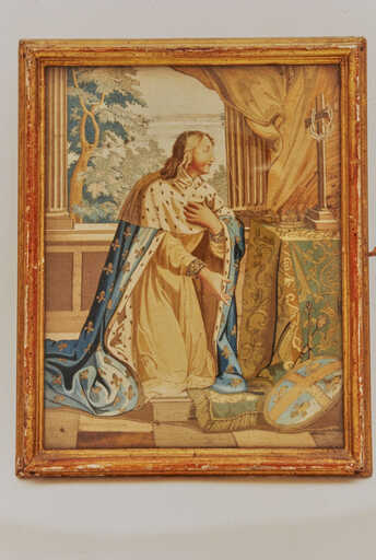 19966004115ZA - tableau de broderie : Adoration de la couronne d'épines par saint Louis