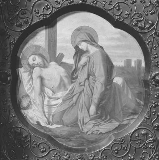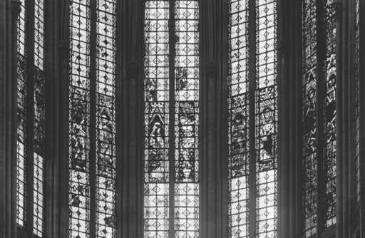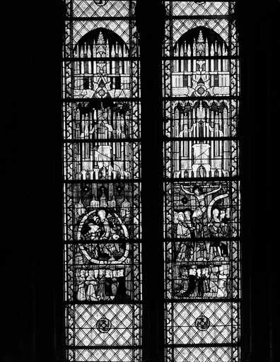 19996001747X - verrières des fenêtres hautes (baies 300 à 306) : Christ en croix, la Vierge et les apôtres