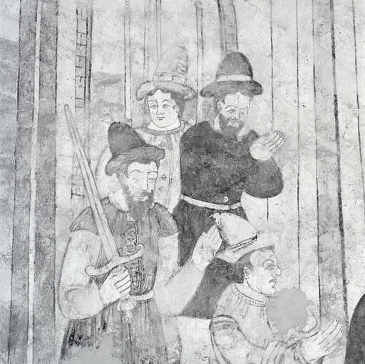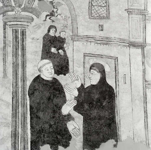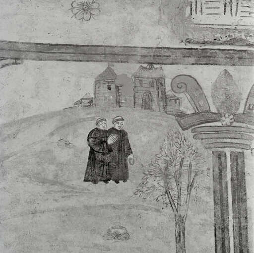 20000201332X - peinture monumentale : saint Benoît admoneste deux frères ayant mangé en dehors du monastère et réprimande un pèlerin, frère du moine Valentinien, ayant interrompu son jeûne