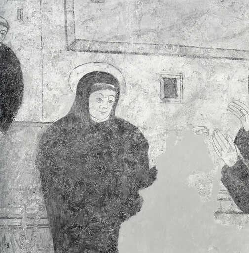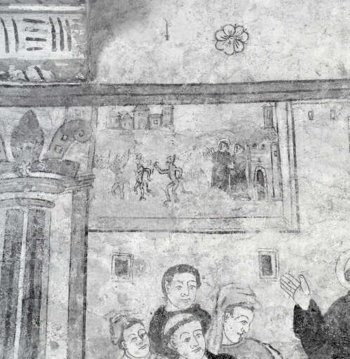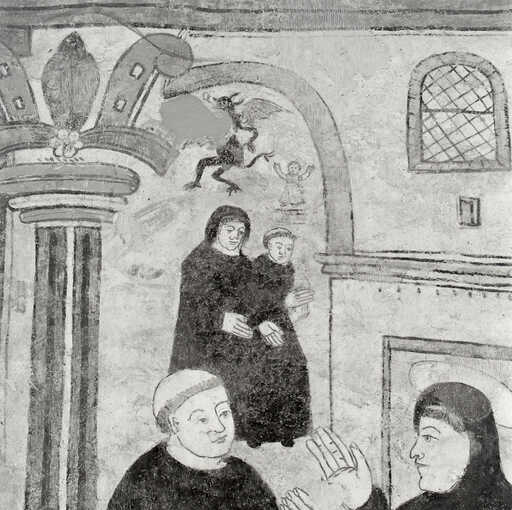 20000201326X - peinture monumentale : saint Benoît prédit à l'évêque de Canosa la chute de Rome, chasse un esprit mauvais d'un clerc d'Aquin et prophétise la destruction prochaine du Mont Cassin